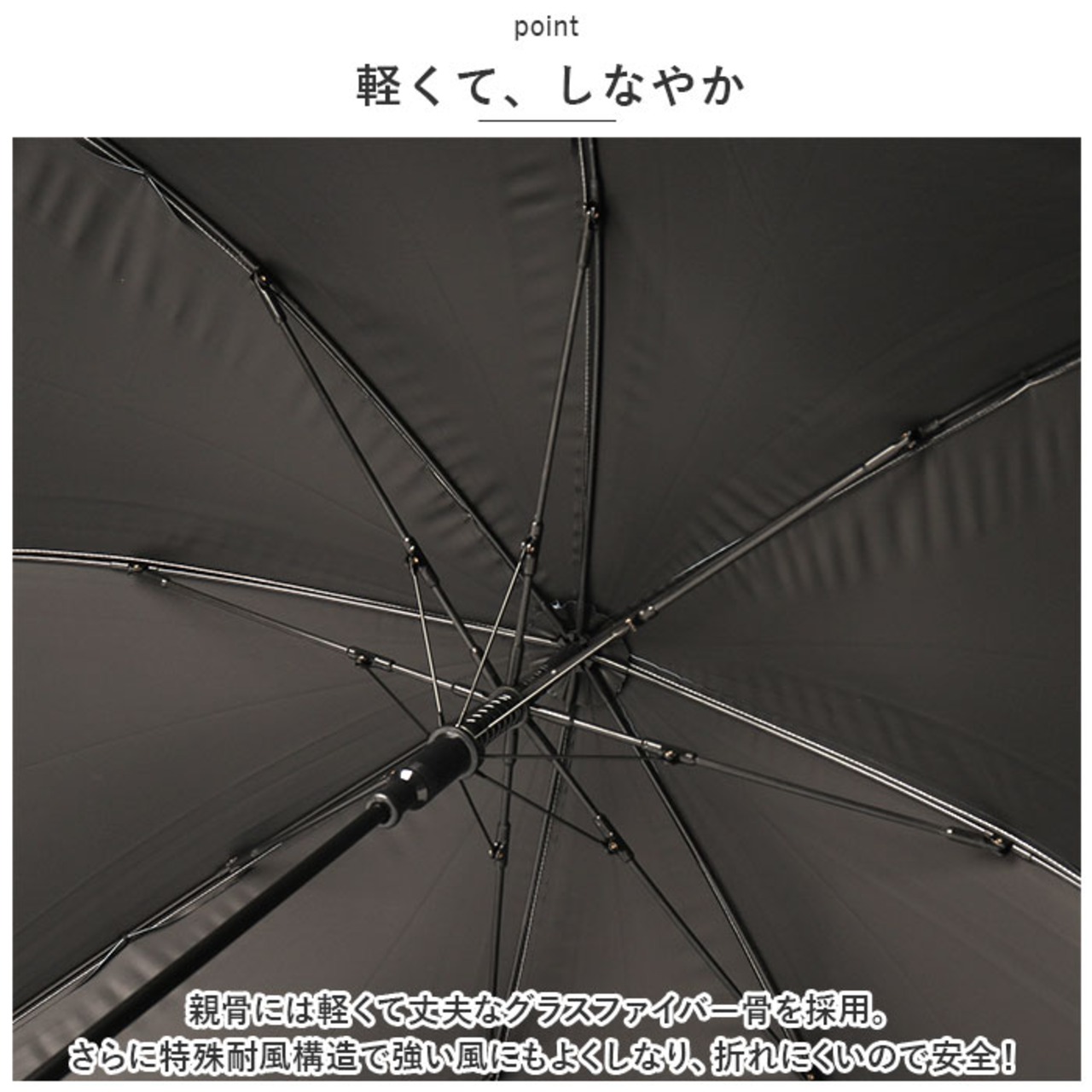 ・親骨には軽くて丈夫なグラスファイバー骨を採用。さらに特殊耐風構造で強い風にもよくしなり、折れにくいので安全!