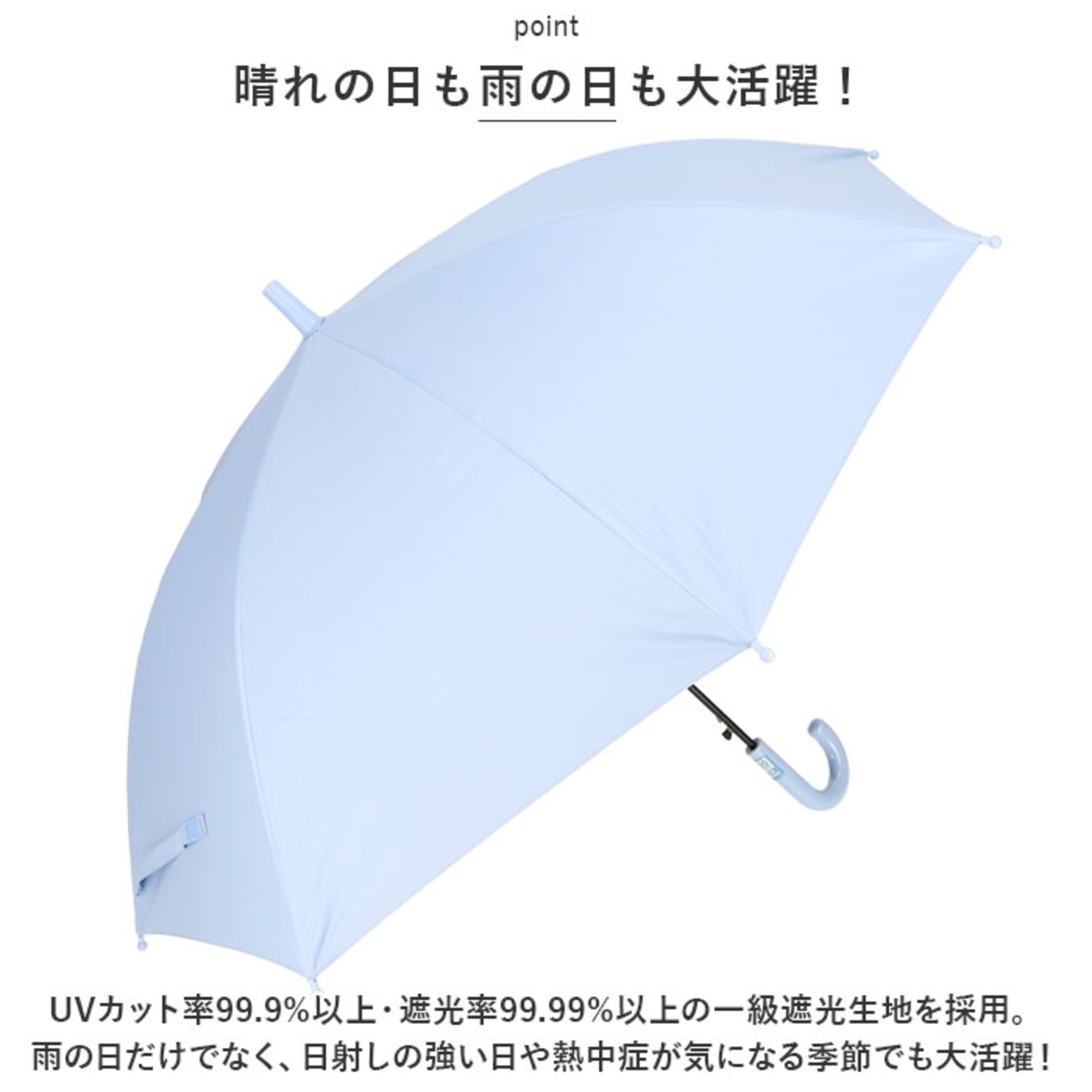 ・UVカット率99.9%以上・遮光率99.99%以上の一級遮光生地を採用。雨の日だけでなく、日射しの強い日や熱中症が気になる季節でも大活躍!