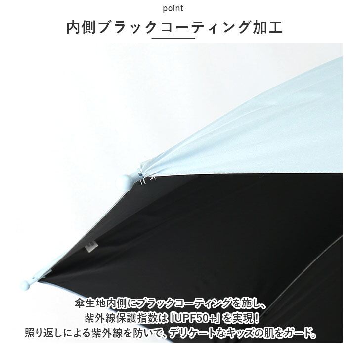 ・傘生地内側にブラックコーティングを施し、紫外線保護指数は「UPF50+」を実現!照り返しによる紫外線を防いで、デリケートなキッズの肌をガード。