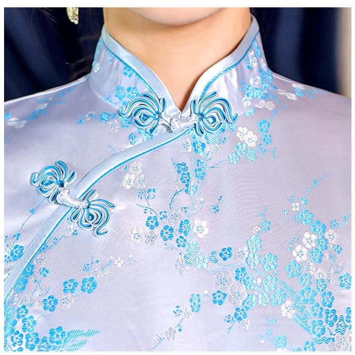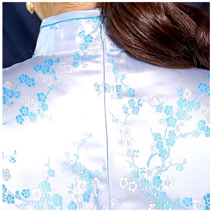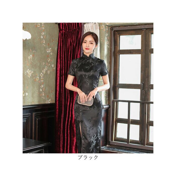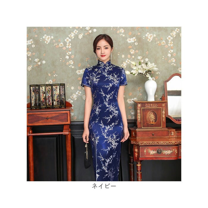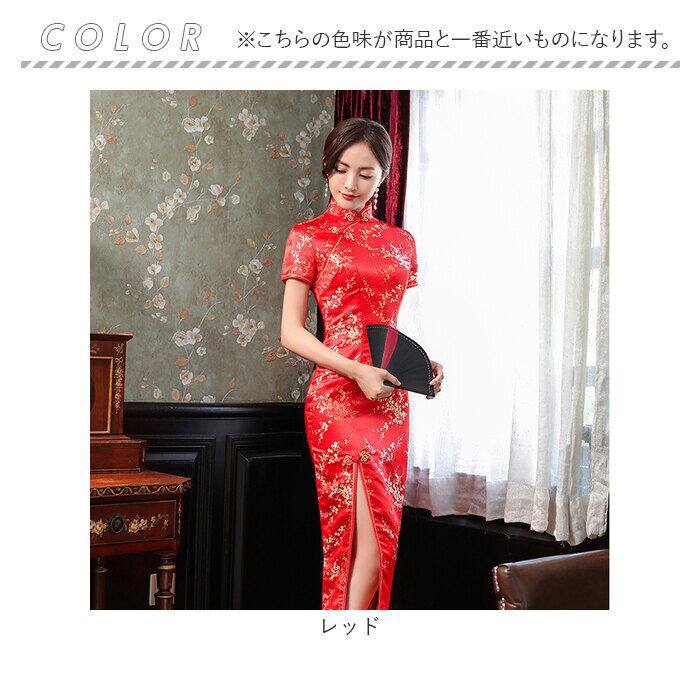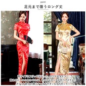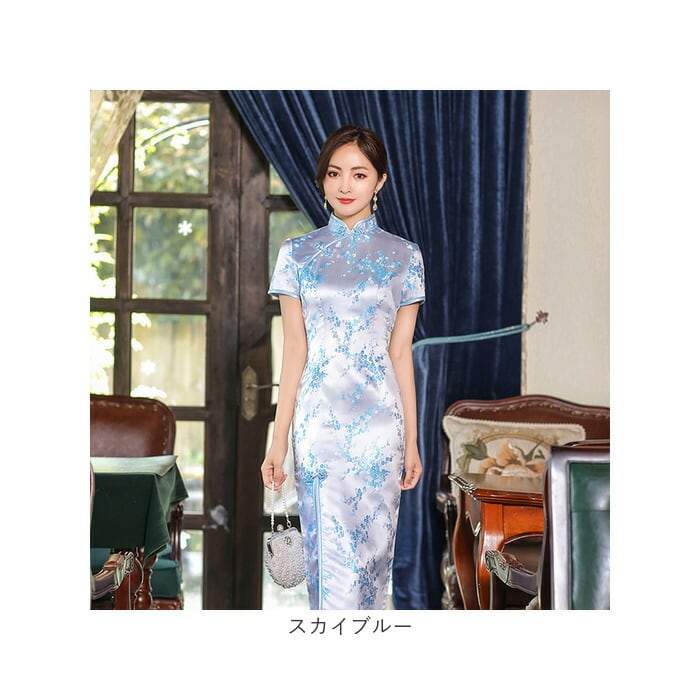 ・程よい光沢とハリのある生地に、鮮やかな刺繍デザインを施した1着。定番チャイナドレスの雰囲気漂う仕上がり。