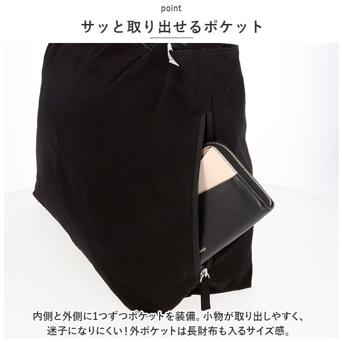 ・内側と外側に1つずつポケットを装備。小物が取り出しやすく、迷子になりにくい!外ポケットは長財布も入るサイズ感。