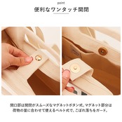 ・開口部は開閉がスムーズなマグネットボタン式。マグネット部分は荷物の量に合わせて使えるベルト式で、こぼれ落ちをガード。
