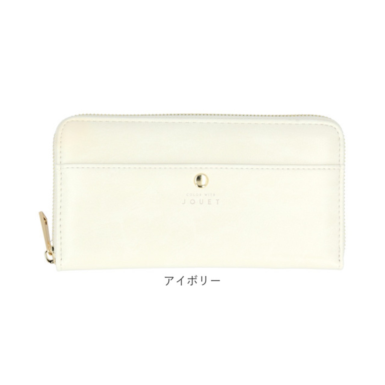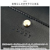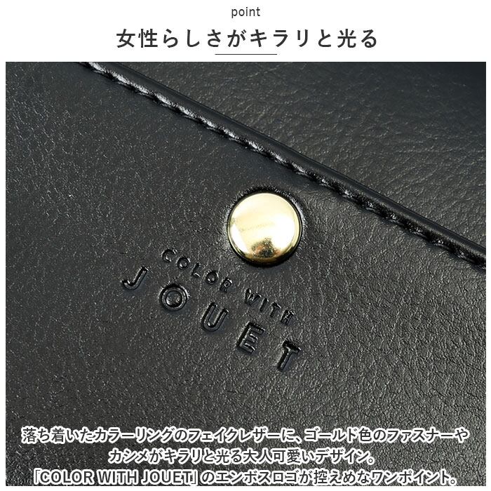 ・落ち着いたカラーリングのフェイクレザーに、ゴールド色のファスナーやカシメがキラリと光る大人可愛いデザイン。「COLOR WITH JOUET」のエンボスロゴが控えめなワンポイント。