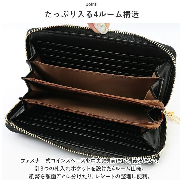 ・ファスナー式コインスペースを中央に、前に1つ、後ろに2つ、計3つの札入れポケットを設けた4ルーム仕様。紙幣を額面ごとに分けたり、レシートの整理に便利。