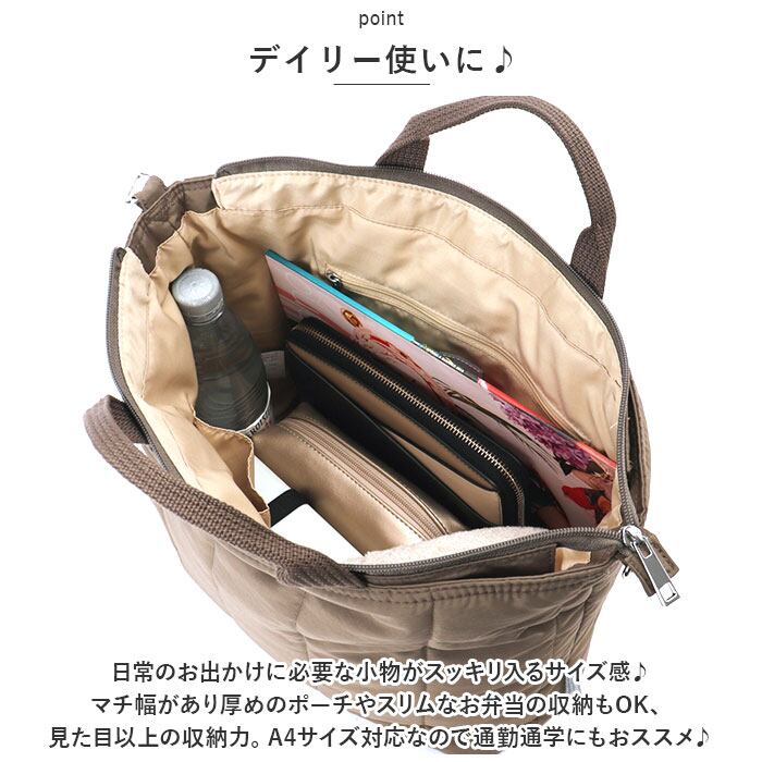 ・日常のお出かけに必要な小物がスッキリ入るサイズ感♪マチ幅があり厚めのポーチやスリムなお弁当の収納もOK、見た目以上の収納力。