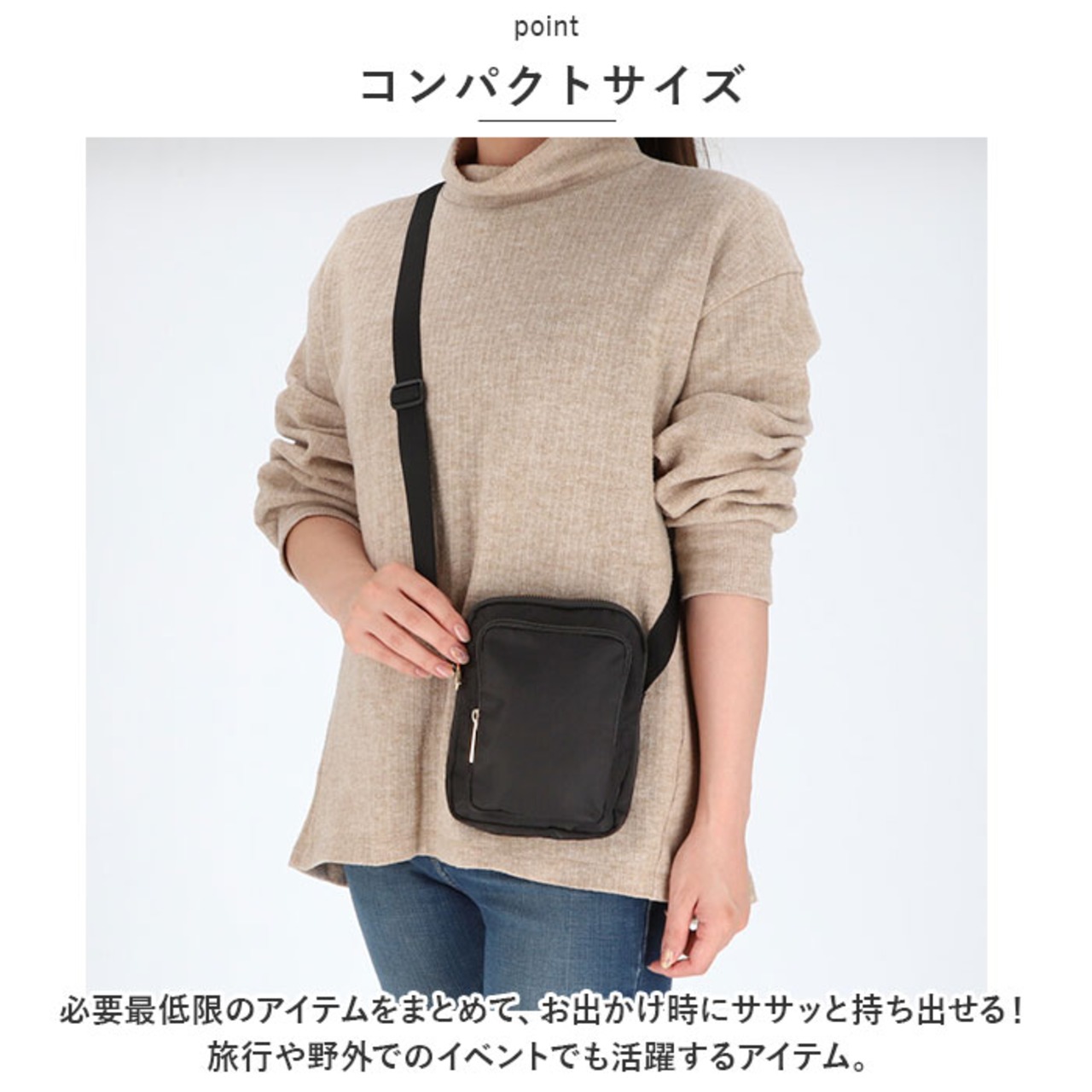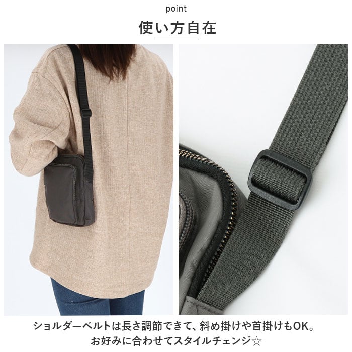 ・ショルダーベルトは長さ調節できて、斜め掛けや首掛けもOK。お好みに合わせてスタイルチェンジ☆