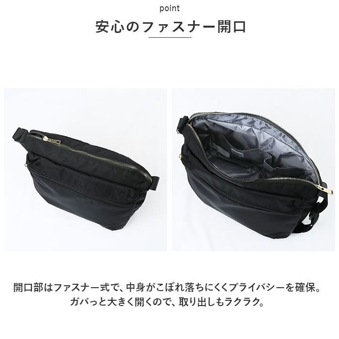 ・開口部はファスナー式で、中身がこぼれ落ちにくくプライバシーを確保。ガバっと大きく開くので、取り出しもラクラク。