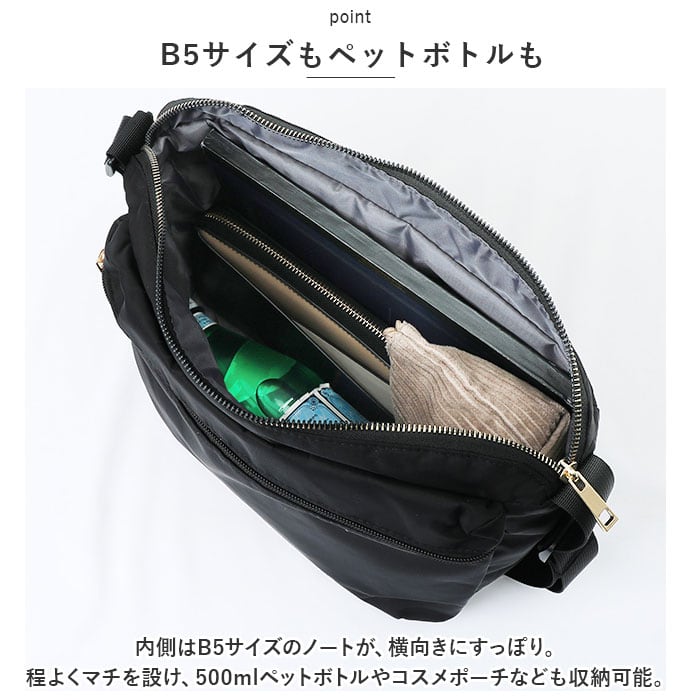 ・内側はB5サイズのノートが、横向きにすっぽり。程よくマチを設け、500mlペットボトルやコスメポーチなども収納可能。