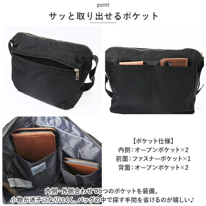 ・内側・外側合わせて5つのポケットを装備。小物が迷子になりにくく、バッグの中で探す手間を省けるのが嬉しい♪