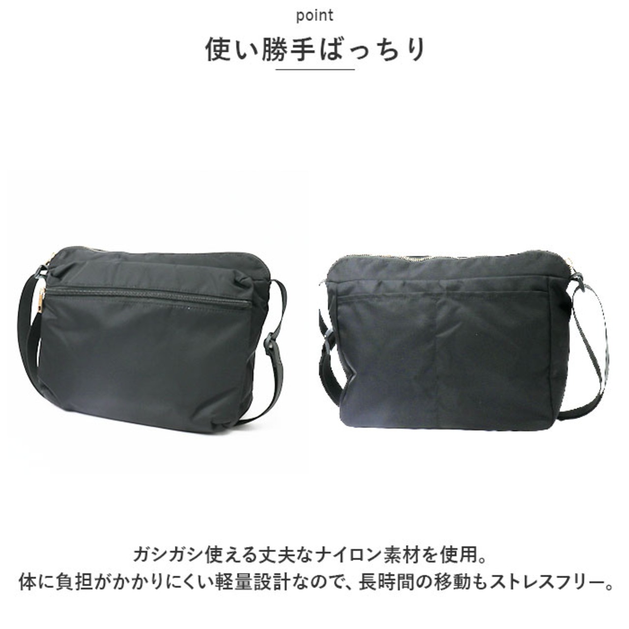 ・ガシガシ使える丈夫なナイロン素材を使用。体に負担がかかりにくい軽量設計なので、長時間の移動もストレスフリー。