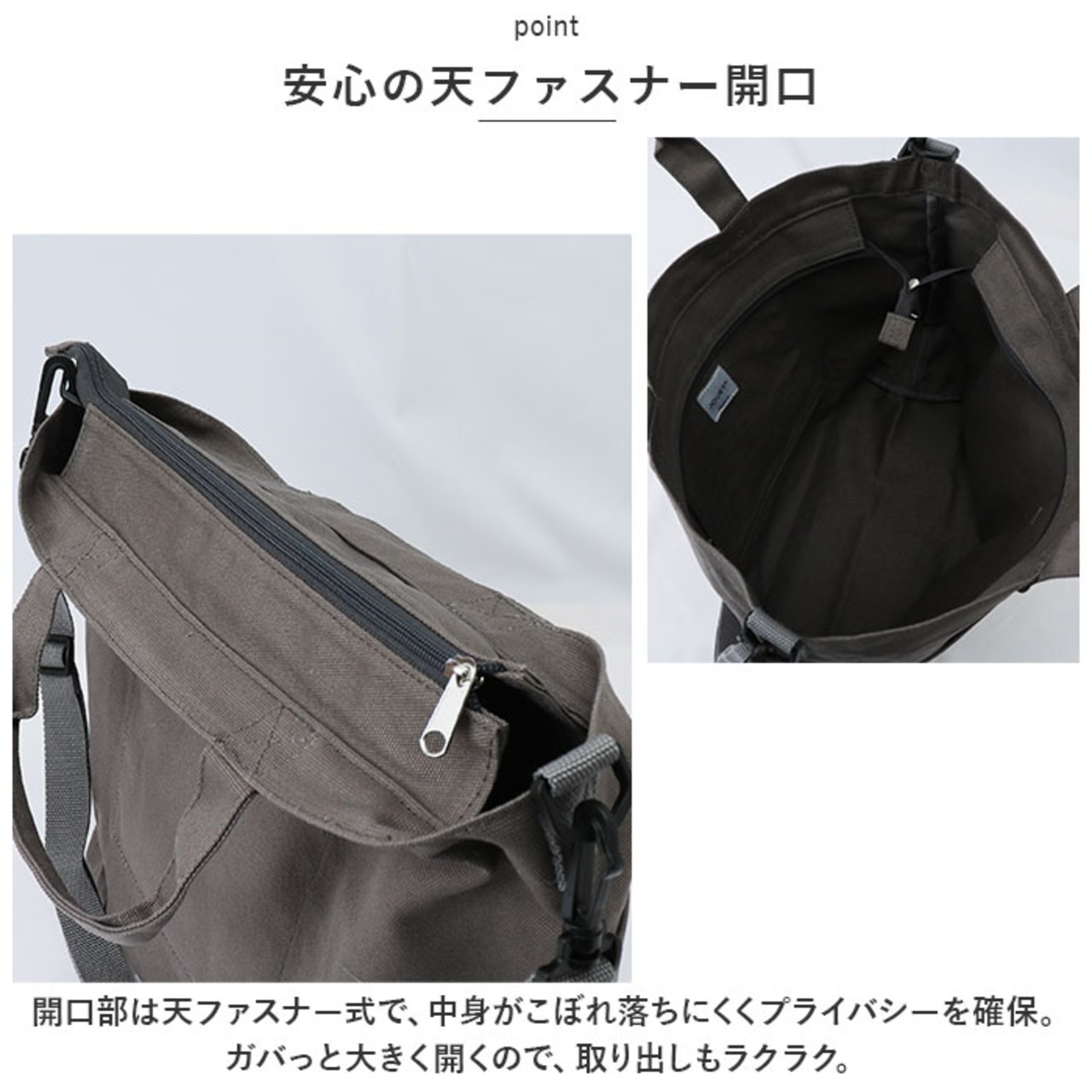 ・開口部は天ファスナー式で、中身がこぼれ落ちにくくプライバシーを確保。ガバっと大きく開くので、取り出しもラクラク。