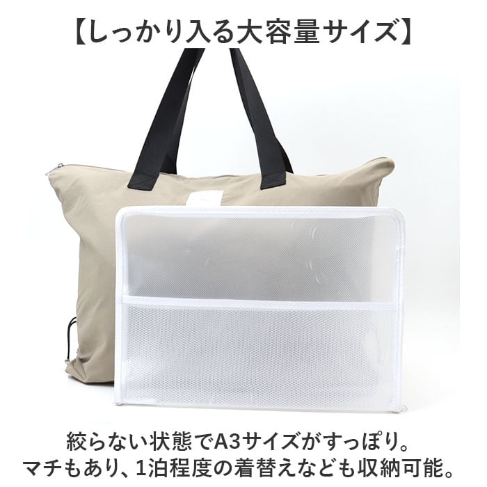 ・絞らない状態でA3サイズがすっぽり。マチもあり、1泊程度の着替えなども収納可能。