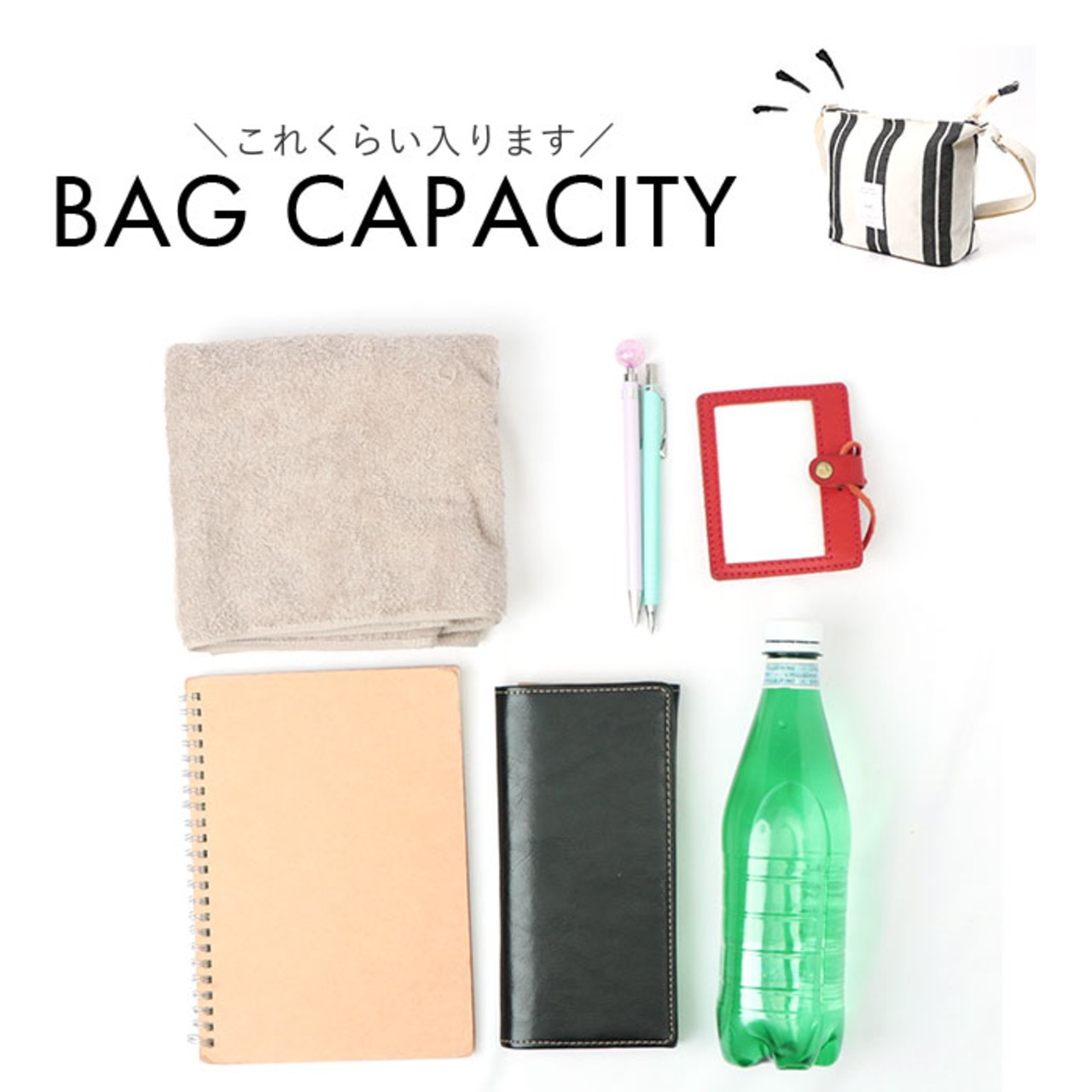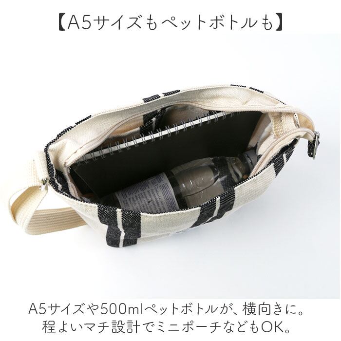 ・A5サイズや500mlペットボトルが、横向きに。程よいマチ設計でミニポーチなどもOK。