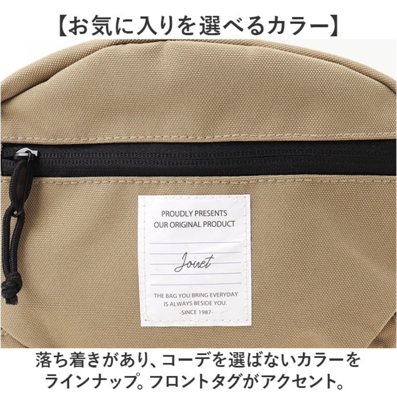 ・落ち着きがあり、コーデを選ばないカラーをラインナップ。フロントタグがアクセント。