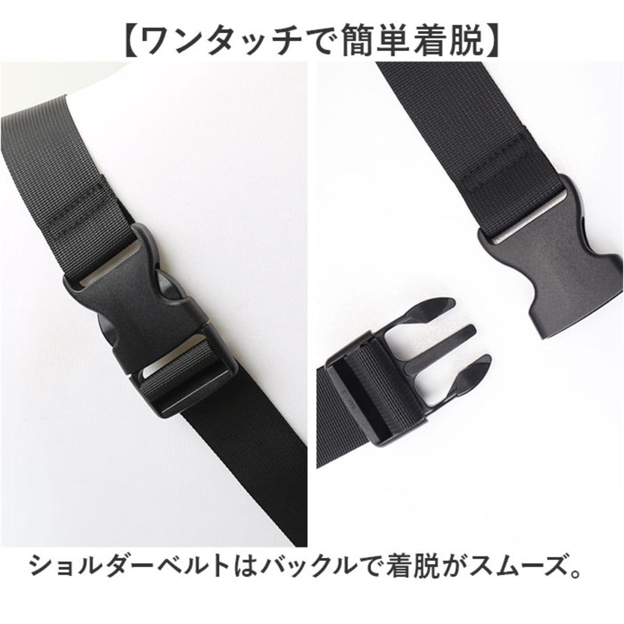 ・ショルダーベルトはバックルで着脱がスムーズ。