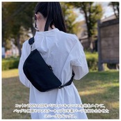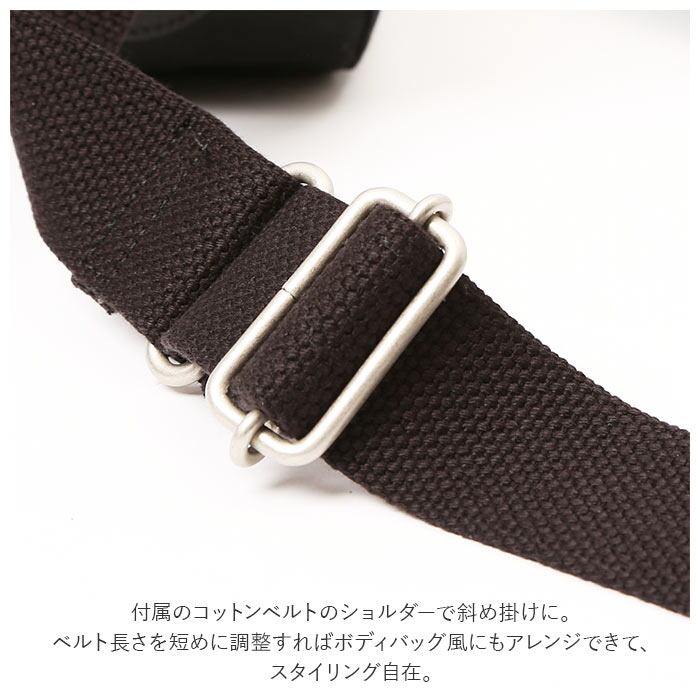 ・付属のコットンベルトのショルダーで斜め掛けに。ベルト長さを短めに調整すればボディバッグ風にもアレンジできて、スタイリング自在。