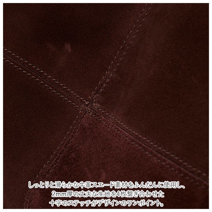 ・しっとりと滑らかな牛革スエード素材をふんだんに使用し、2mm厚の丈夫な生地を4枚繋ぎ合わせた十字のステッチがデザインのワンポイント。