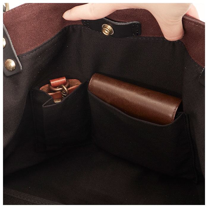 ・バッグ内側にはファスナーポケット×1、オープンポケット×2を設け、スマホや二つ折財布など、使用頻度の高い小物がサッと取り出しやすいつくり。