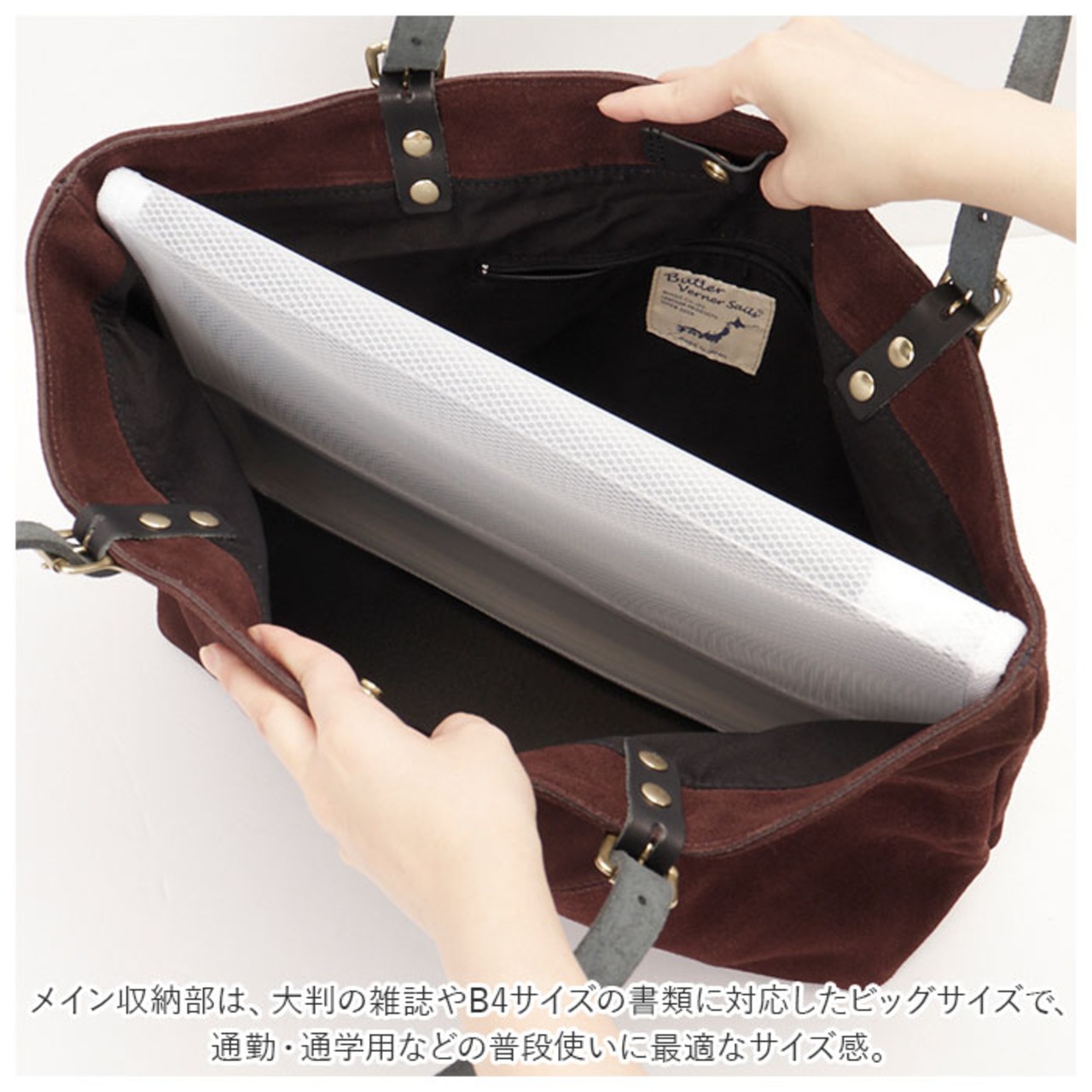・メイン収納部は、大判の雑誌やB4サイズの書類に対応したビッグサイズで、通勤・通学用などの普段使いに最適なサイズ感。