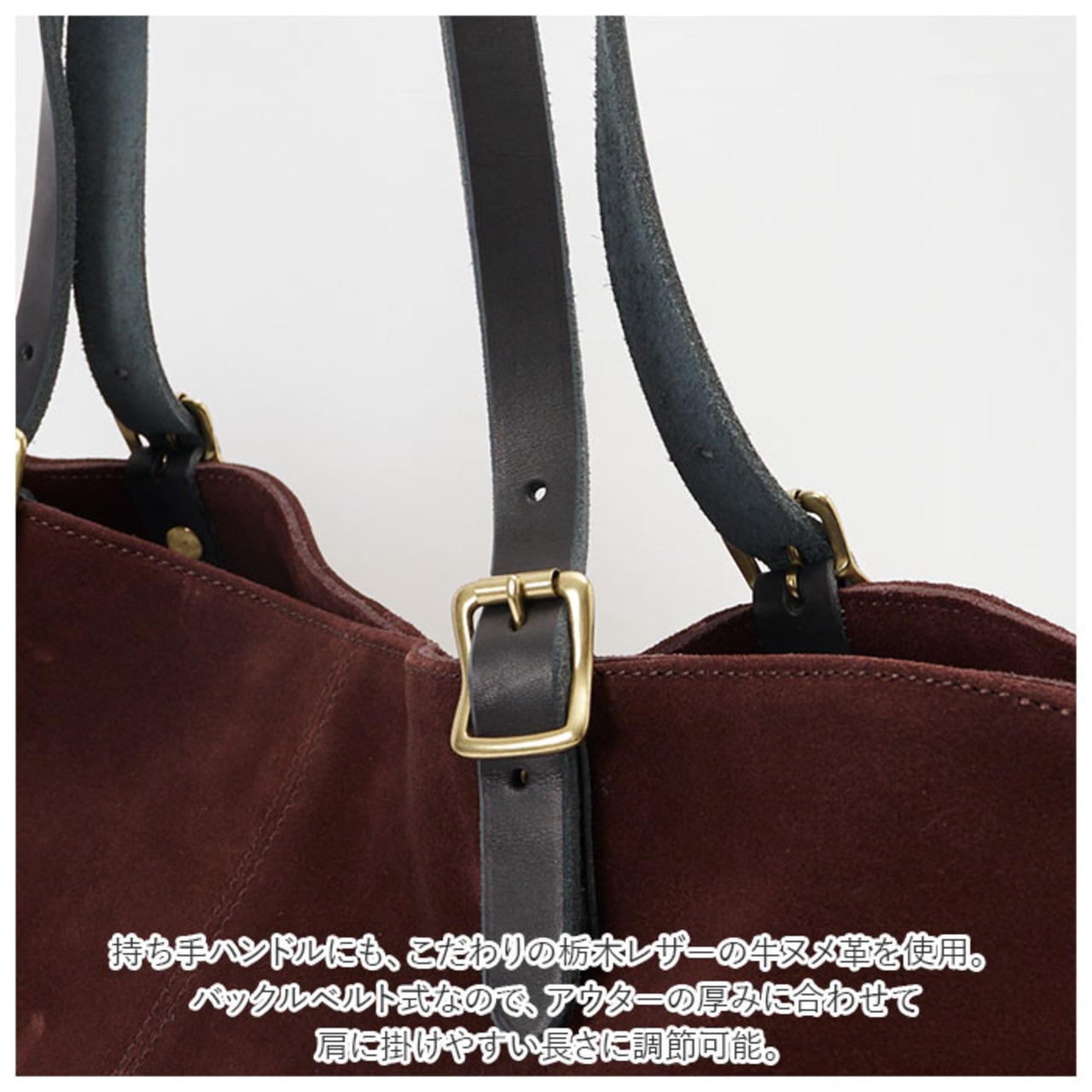 ・持ち手ハンドルにも、こだわりの栃木レザーの牛ヌメ革を使用。バックルベルト式なので、アウターの厚みに合わせて肩に掛けやすい長さに調節可能。