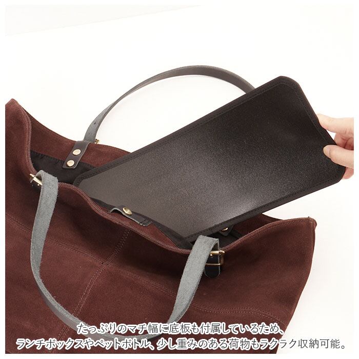 ・たっぷりのマチ幅に底板も付属しているため、ランチボックスやペットボトル、少し重みのある荷物もラクラク収納可能。