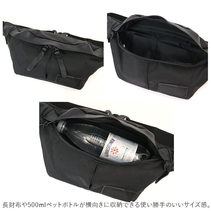 ・メインルーム開口部には左右どちらからも開きやすいダブルファスナーを採用し、長財布や500mlペットボトルが横向きに収納できる使い勝手のいいサイズ感。