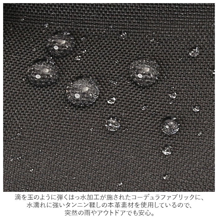 ・水滴を玉のように弾くはっ水加工が施されたコーデュラファブリックに、水濡れに強いタンニン鞣しの本革素材を使用しているので、突然の雨やアウトドアでも安心。