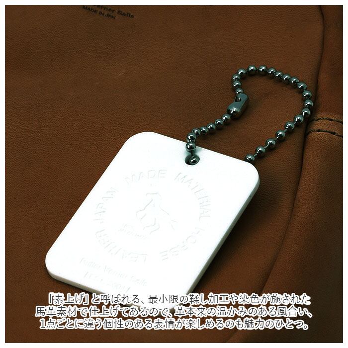 「素上げ」と呼ばれる、最小限の鞣し加工や染色が施された馬革素材で仕上げてあるので、革本来の温かみのある風合い、1点ごとに違う個性のある表情が楽しめるのも魅力のひとつ。安心のMade in Japan製品。