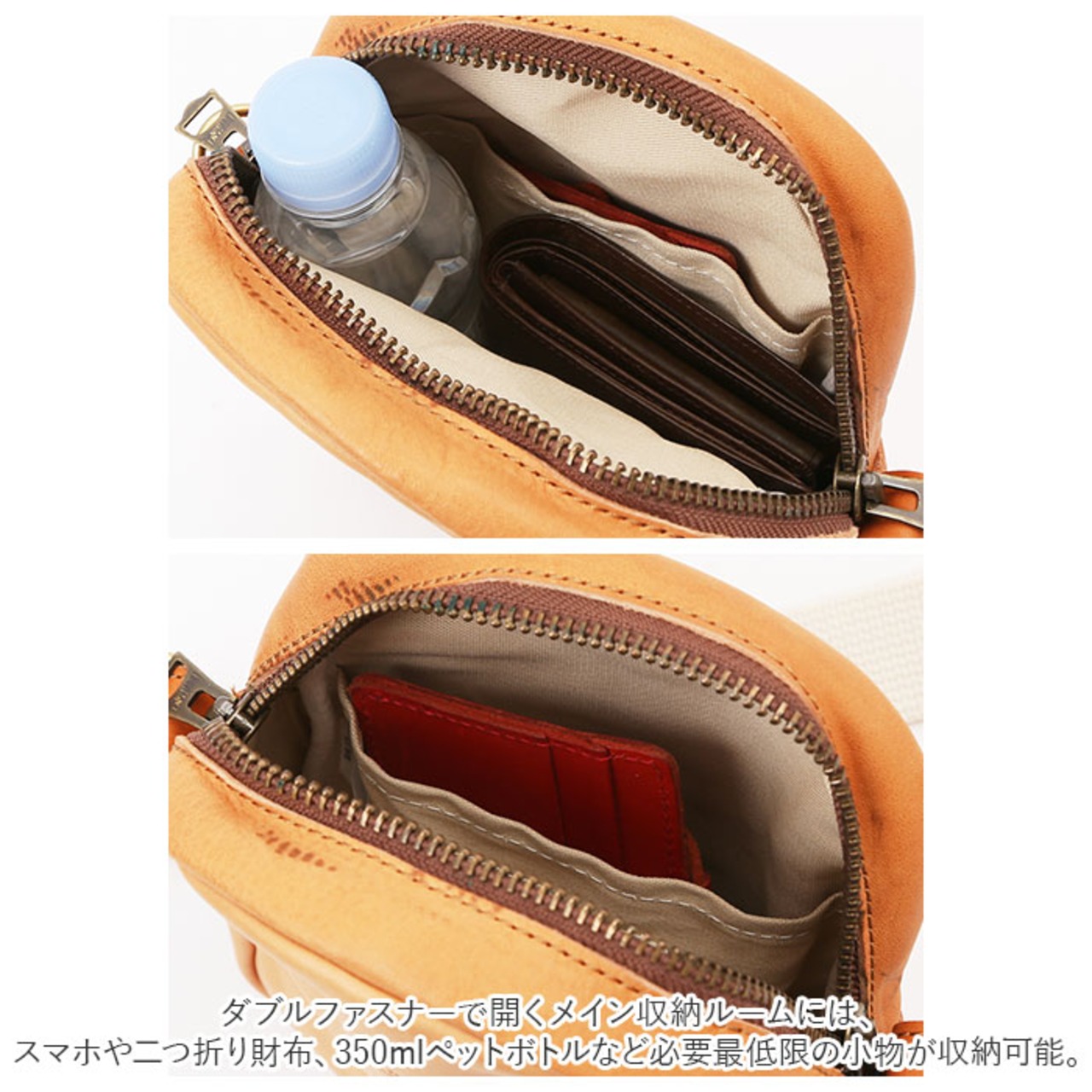 ・ダブルファスナーで開くメイン収納ルームには、スマホや二つ折り財布、350mlペットボトルなど必要最低限の小物が収納可能。