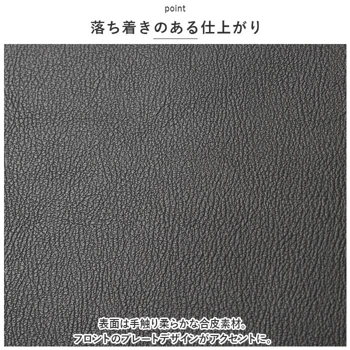 ・表面は手触り柔らかな合皮素材。フロントのプレートデザインがアクセントに。