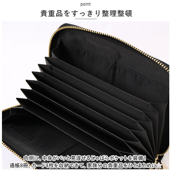 ・内側に、中身がパッと見渡せるじゃばらポケットを装備!通帳8冊、カード4枚を収納できて、家族分の貴重品をひとまとめに☆