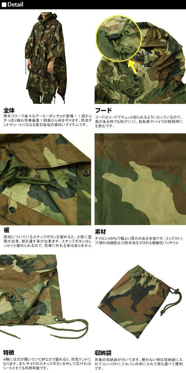 ミリタリーファッションにもってこいのポンチョになります。簡易テントとしても使える優れものです。リップストップ(破れ伝染防止)防水ナイロンで水をとおさない機能性抜群の商品なのでアウトドアはもちろんのこと自転車やバイクの移動時にも便利で安全に使える商品です。