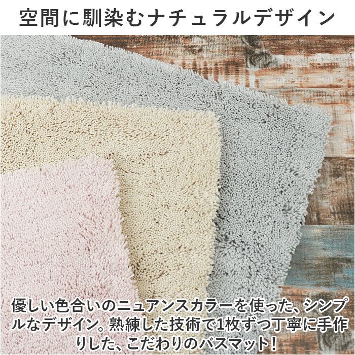 ・優しい色合いのニュアンスカラーを使った、シンプルなデザイン。熟練した技術で1枚ずつ丁寧に手作りした、こだわりのバスマット!