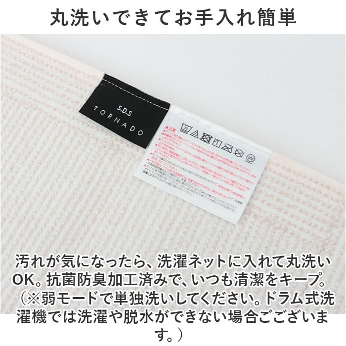 ・汚れが気になったら、洗濯ネットに入れて丸洗いOK。抗菌防臭加工済みで、いつも清潔をキープ。(※弱モードで単独洗いしてください。ドラム式洗濯機では洗濯や脱水ができない場合ごございます。)