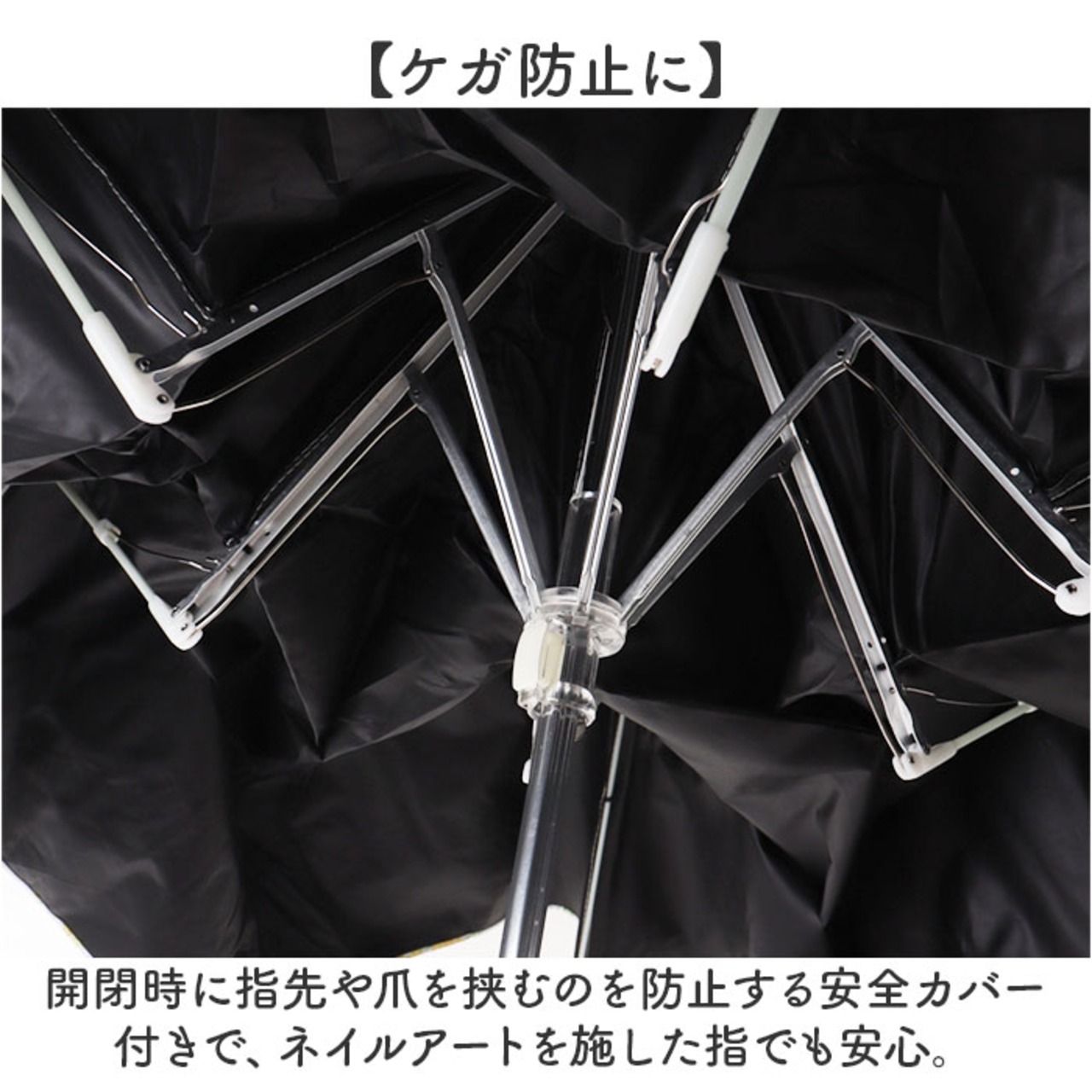 ・開閉時に指先や爪を挟むのを防止する安全カバー付きで、ネイルアートを施した指でも安心。