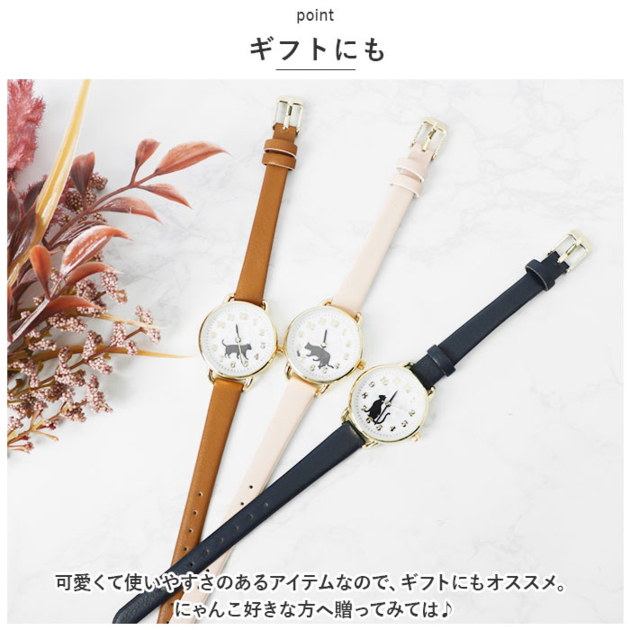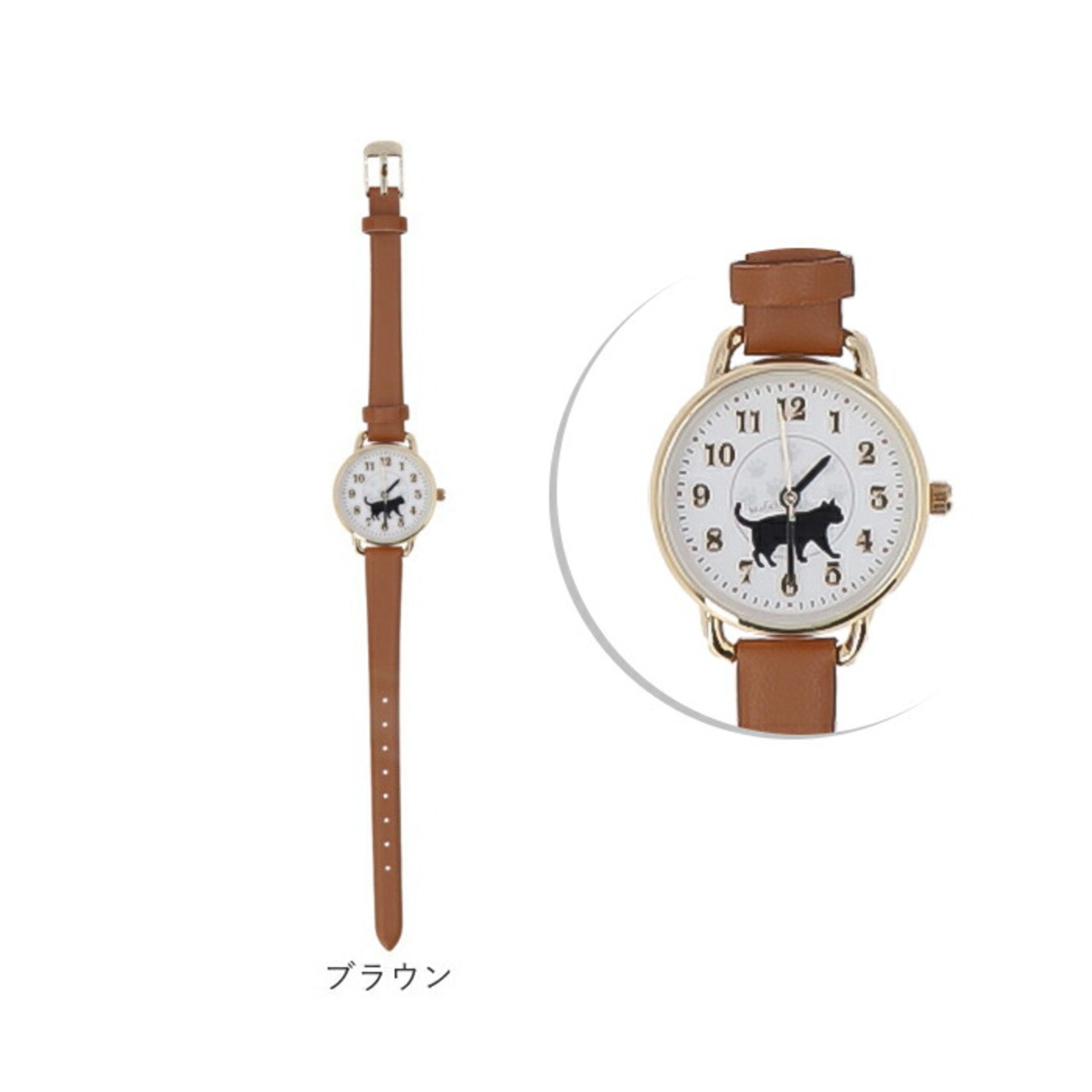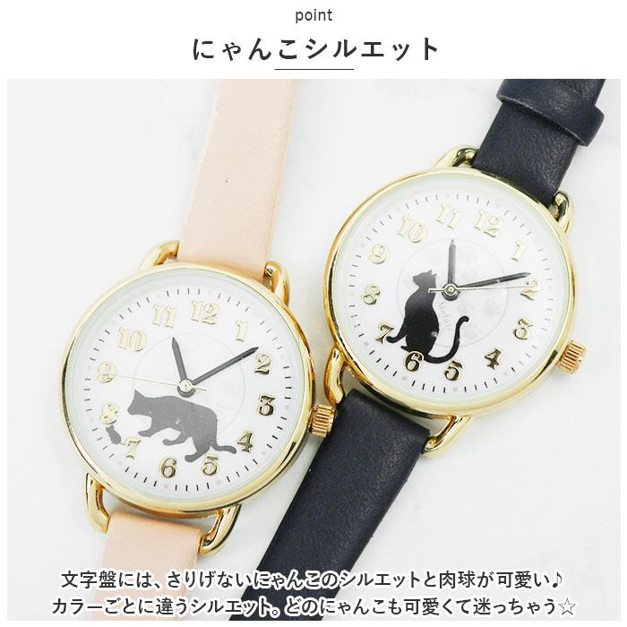 ・文字盤には、さりげないにゃんこのシルエットと肉球が可愛い♪カラーごとに違うシルエット。どのにゃんこも可愛くて迷っちゃう☆