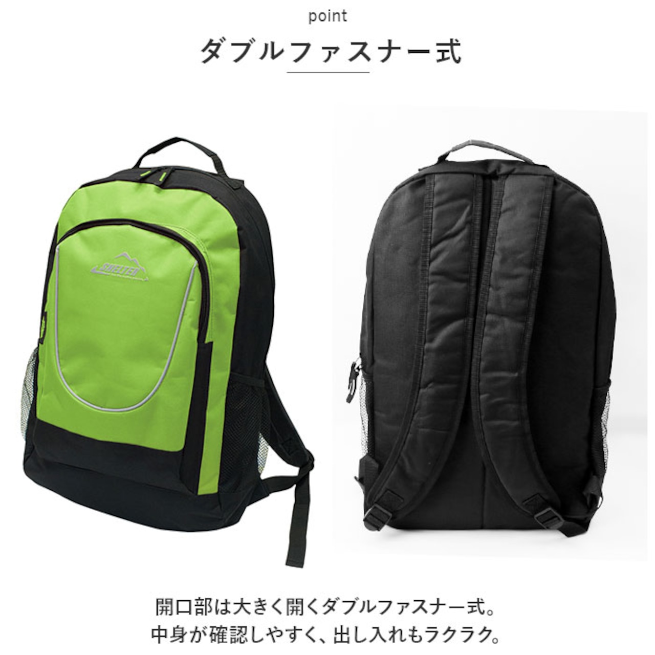 ・開口部は大きく開くダブルファスナー式。中身が確認しやすく、出し入れもラクラク。
