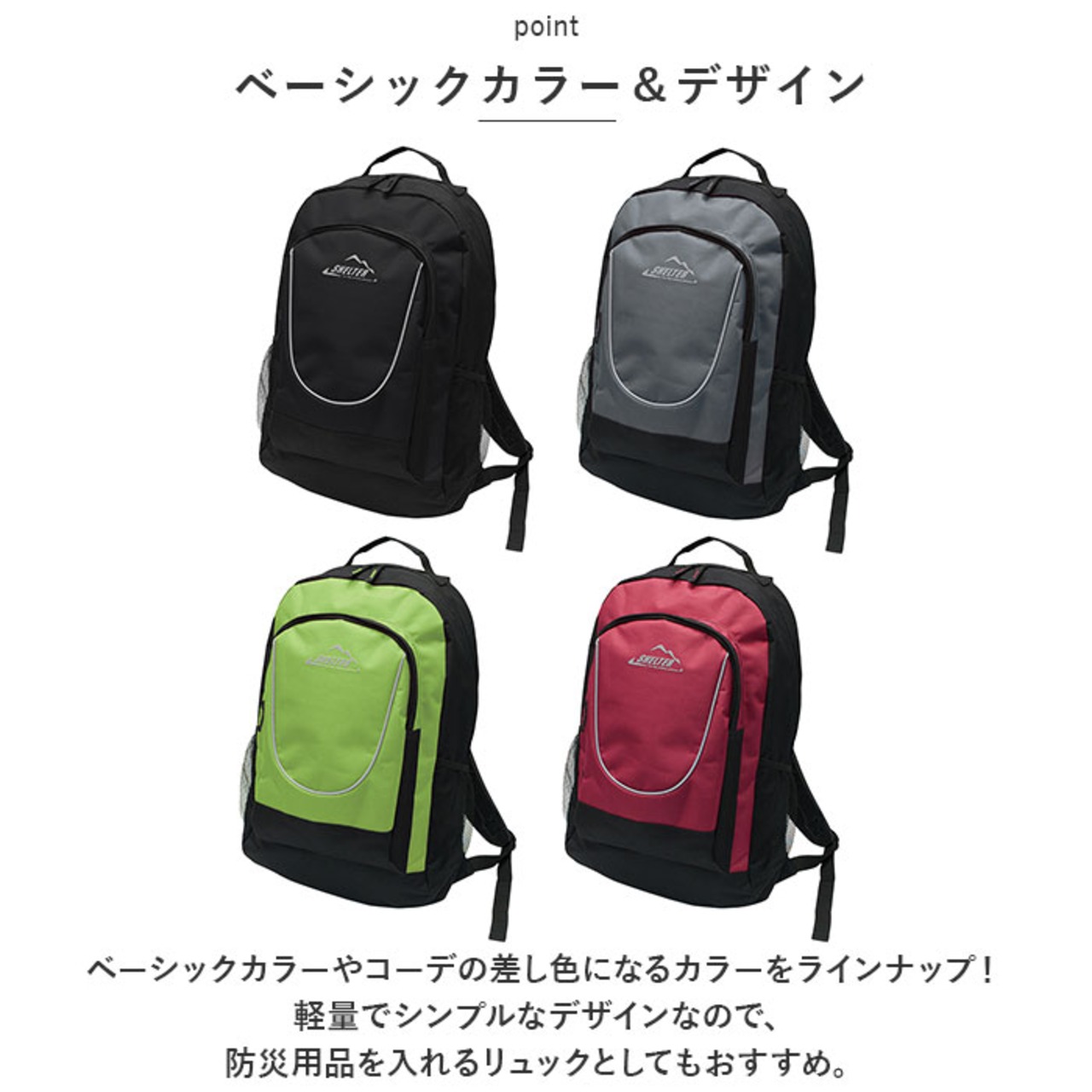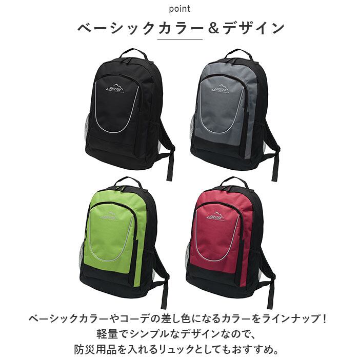 ・ベーシックカラーやコーデの差し色になるカラーをラインナップ!軽量でシンプルなデザインなので、防災用品を入れるリュックとしてもおすすめ。