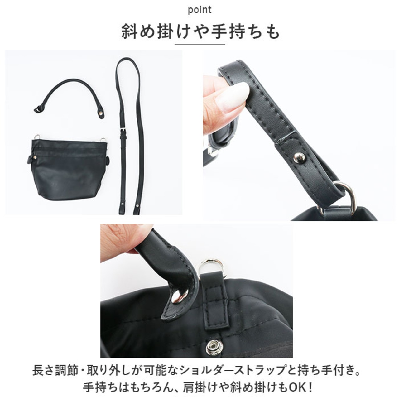・長さ調節・取り外しが可能なショルダーストラップ付き。手持ちはもちろん、肩掛けや斜め掛けもOK!