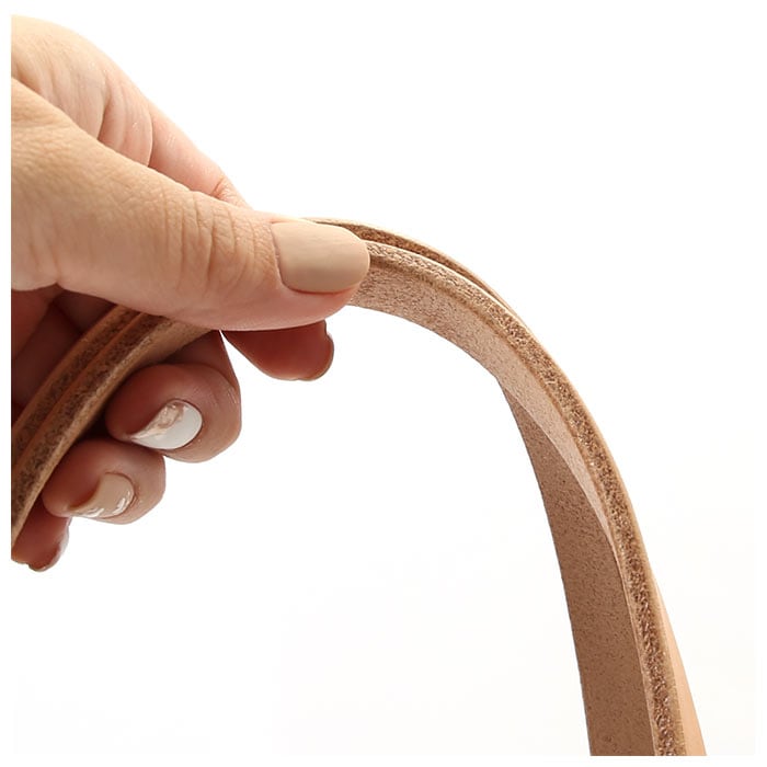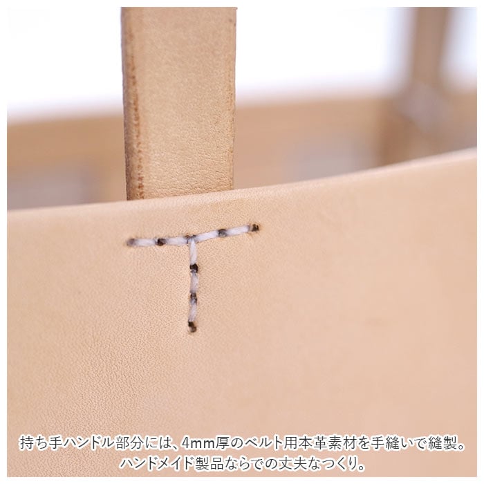 ・持ち手ハンドル部分には、4mm厚のベルト用本革素材を手縫いで縫製。ハンドメイド製品ならでの丈夫なつくり。