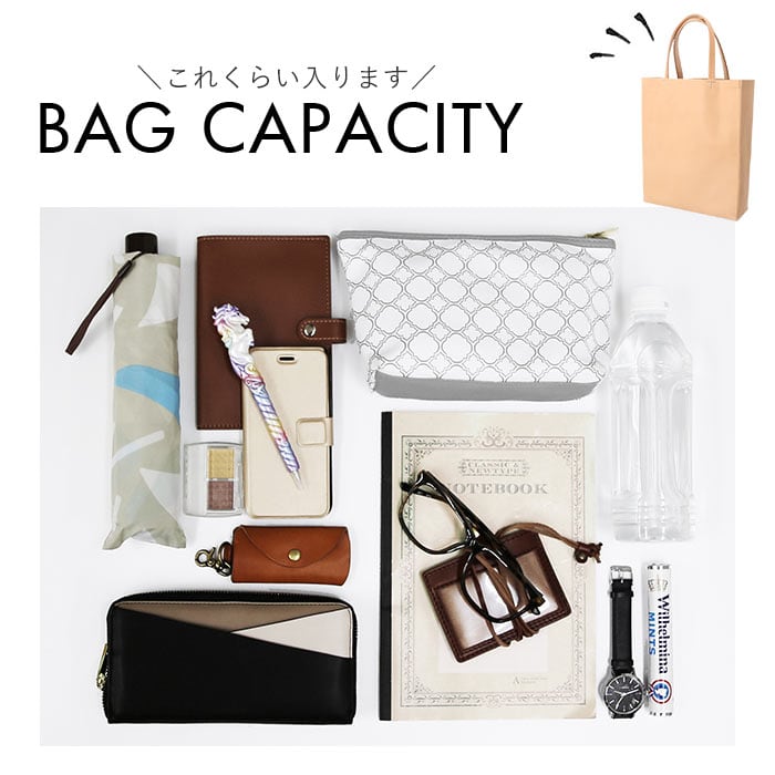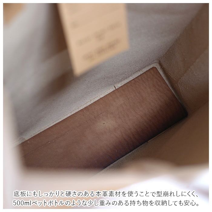 ・底板にもしっかりと硬さのある本革素材を使うことで型崩れしにくく、500mlペットボトルのような少し重みのある持ち物を収納しても安心。
