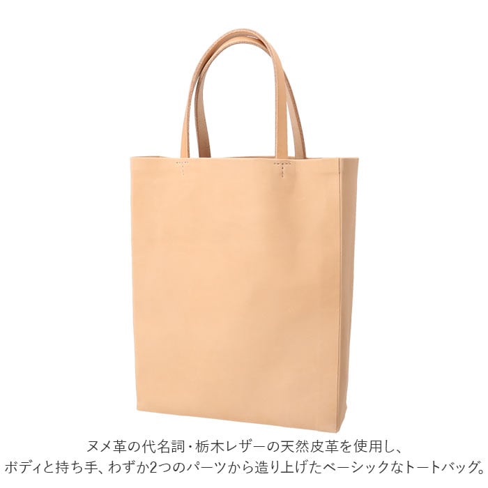 ・ヌメ革の代名詞・栃木レザーの天然皮革を使用し、ボディと持ち手、わずか2つのパーツから造り上げたベーシックなトートバッグ。