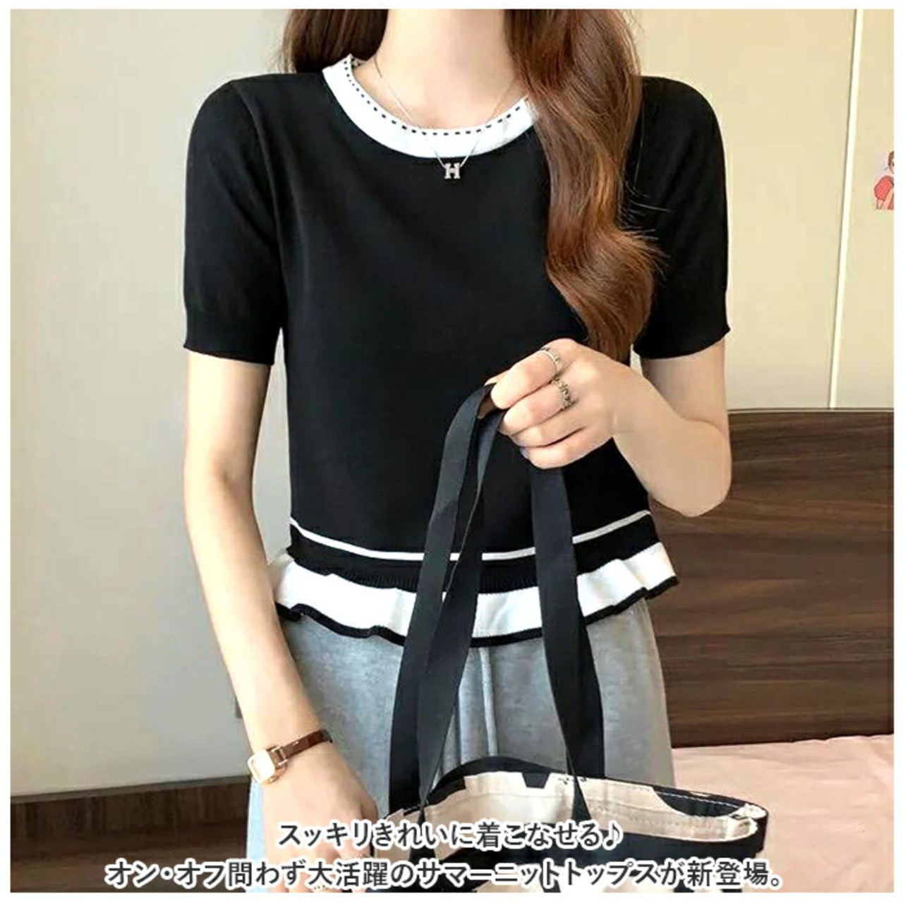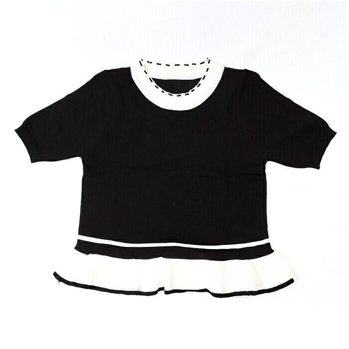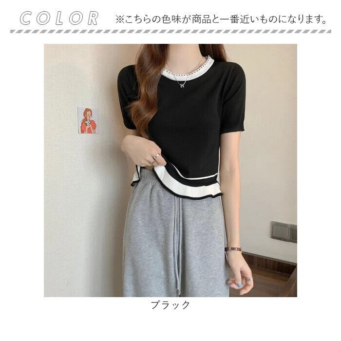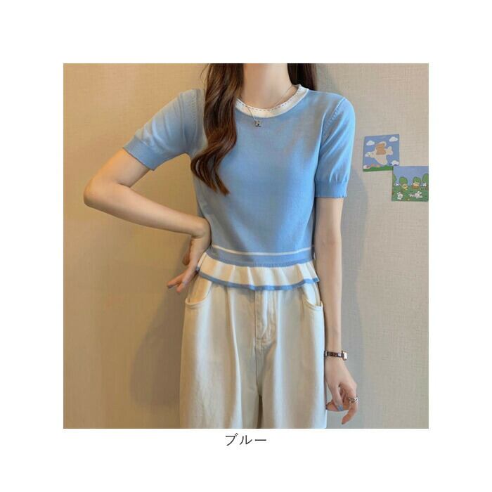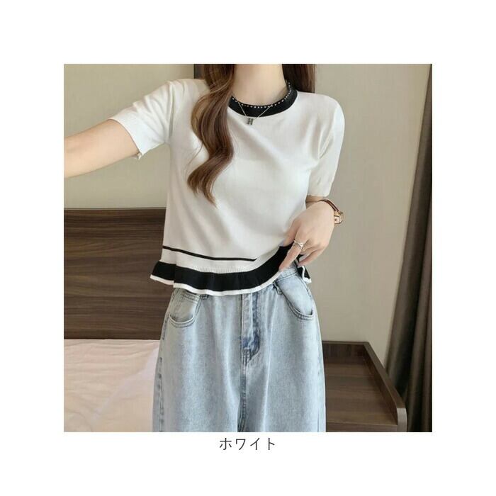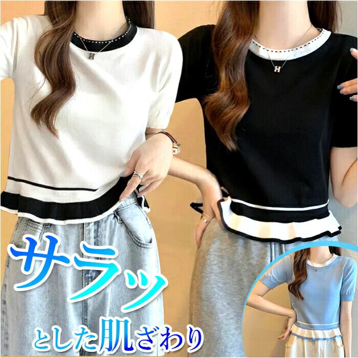 レディース 夏 ニット 通販 Tシャツ tシャツ カットソー サマーニット クルーネック ラウンドネック ショート 半袖 フリル 短め きれいめ トップス 通勤 通学 おしゃれ かわいい