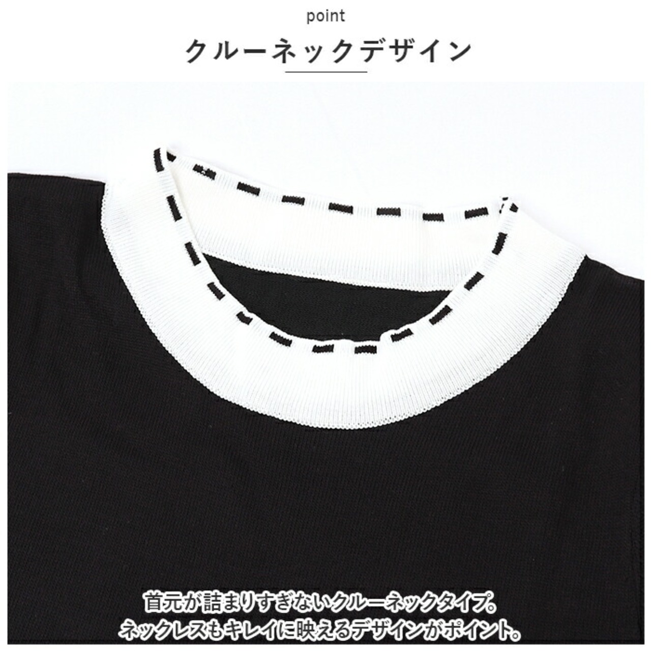 ・首元が詰まりすぎないクルーネックタイプ。ネックレスもキレイに映えるデザインがポイント。