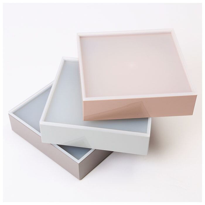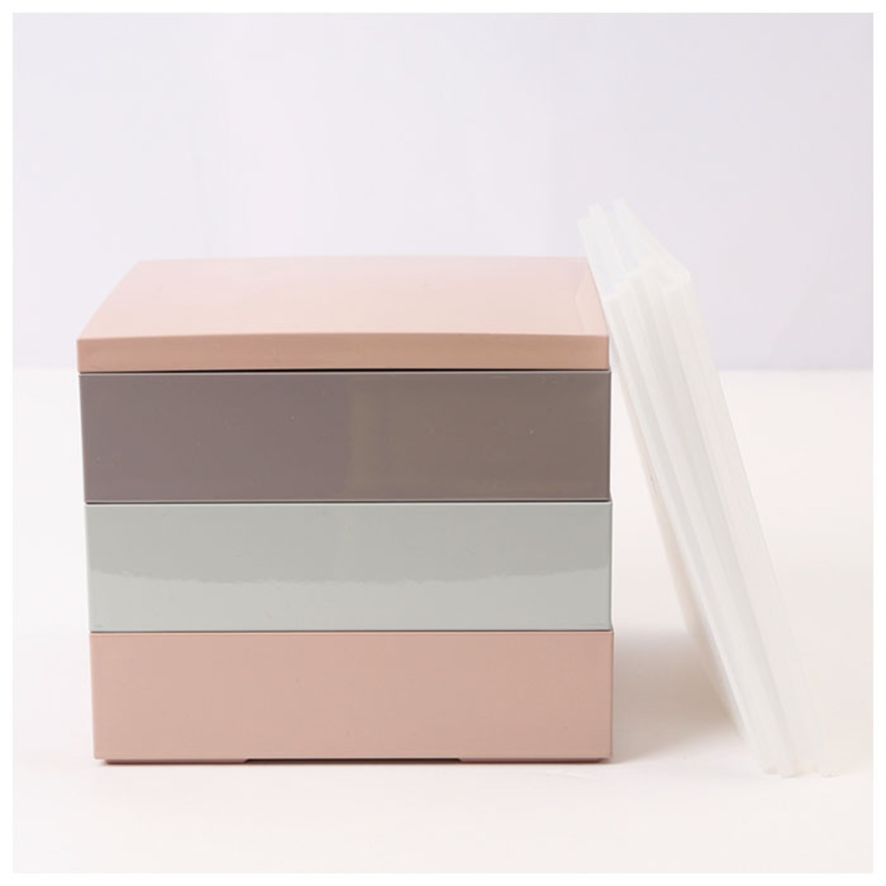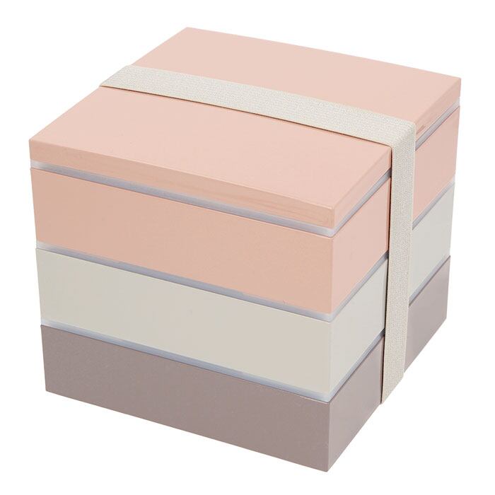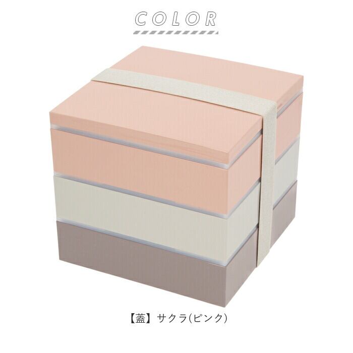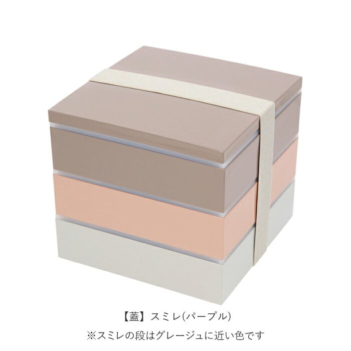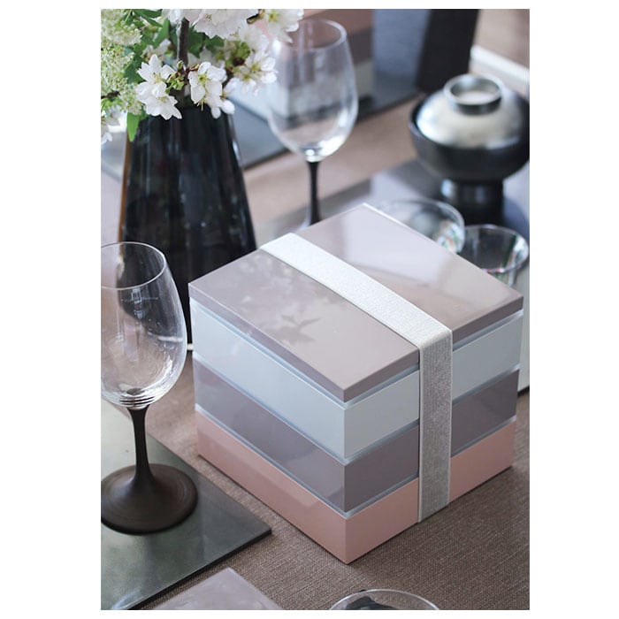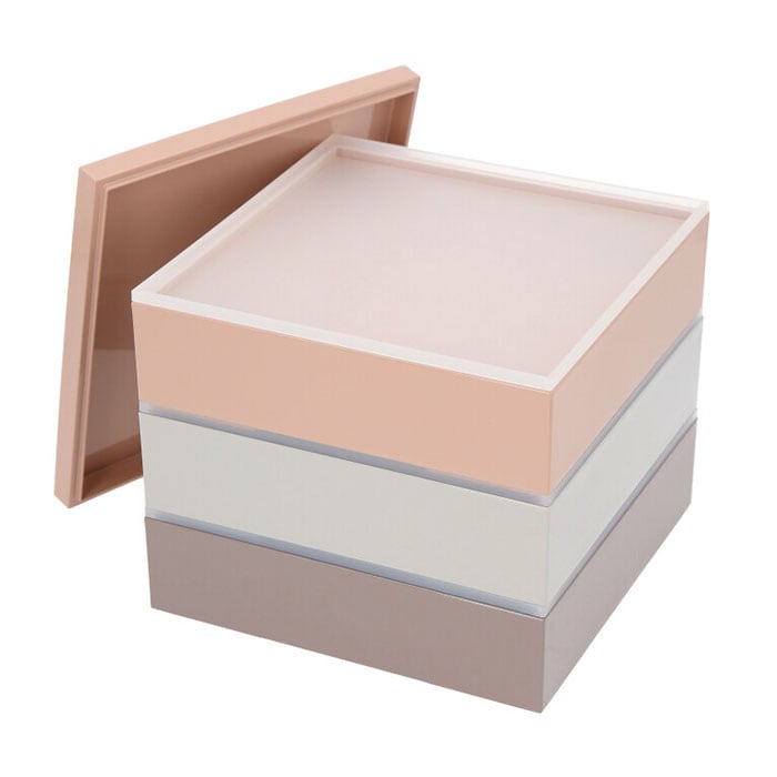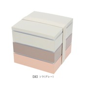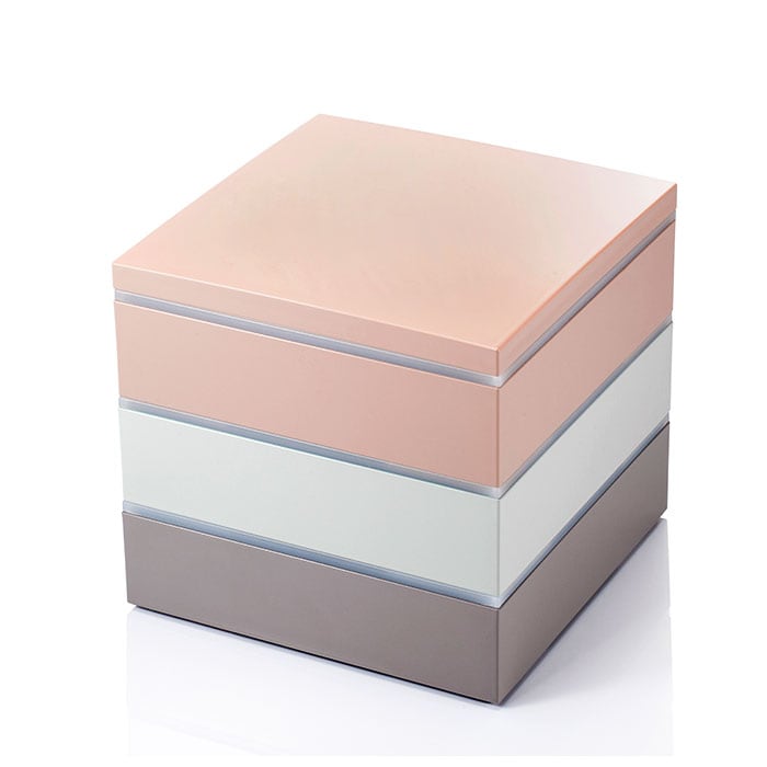 ・サクラ(ピンク)、スミレ(パープル)、ソラ(グレー)の三色のお重がセットになった、正角三段重。食事タイムに彩りを与えてくれる淡いくすみカラーが、とってもおしゃれ♪