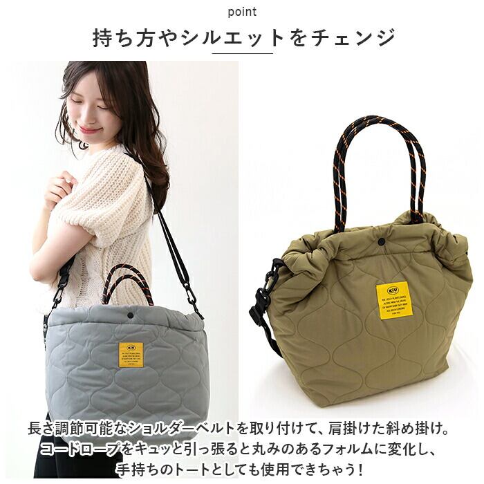 ・長さ調節可能なショルダーベルトを取り付けて、肩掛けた斜め掛け。コードロープをキュッと引っ張ると丸みのあるフォルムに変化し、手持ちのトートとしても使用できちゃう!