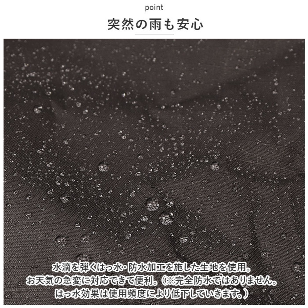 ・水滴を弾くはっ水・防水加工を施した生地を使用。お天気の急変に対応できて便利。(※完全防水ではありません。はっ水効果は使用頻度により低下していきます。)