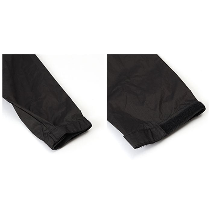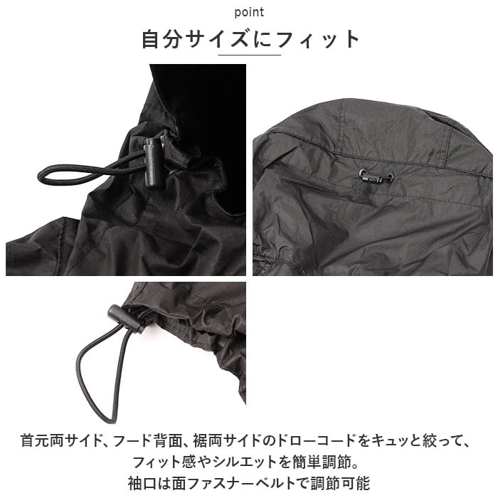 ・首元両サイド、フード背面、裾両サイドのドローコードをキュッと絞って、フィット感やシルエットを簡単調節。袖口は面ファスナーベルトで調節可能。