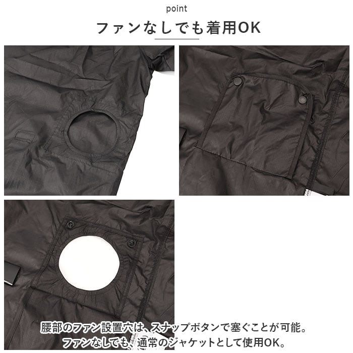 ・腰部のファン設置穴は、スナップボタンで塞ぐことが可能。ファンなしでも、通常のジャケットとして使用OK。