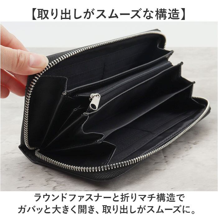 ・ラウンドファスナーと折りマチ構造でガバッと大きく開き、取り出しがスムーズに。